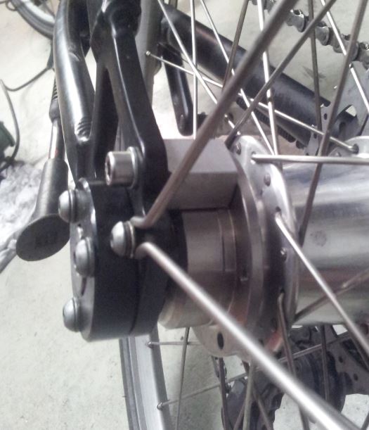 Die SRAM Nabe wurde so eingestellt, dass der 2te Gang fix eingestellt ist, sodass Ritzel und Rad sich 1:1 drehen. Dennoch muss die Achse blockiert werden, da aufgrund der Getriebeeigenschaften man beim Antreten immer ein Stück in Leere tritt, bis der 2te Gang Kraftschluss hat, was unangenehm ist. Das Blockieren der Achse ist relativ einfach mit einem extra dafür angefertigten Adapter, welcher die auf der Achse verbleibende Riemenscheibenaufnahme mit dem Rahmen fest verbindet.